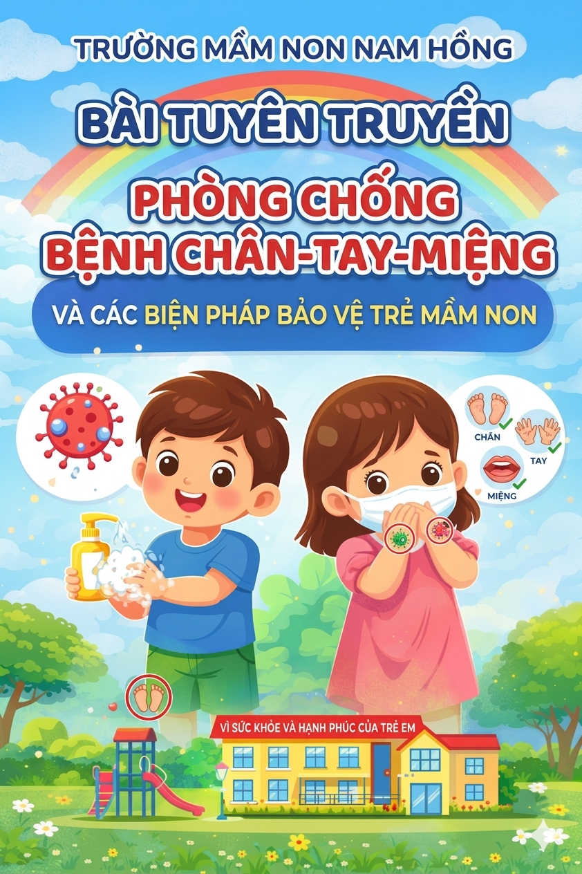 Nhằm chăm sóc và bảo vệ sức khỏe cho trẻ, Trường Mầm non Nam Hồng tăng cường công tác tuyên truyền phòng, chống bệnh chân – tay – miệng. Đây là bệnh truyền nhiễm thường gặp ở trẻ nhỏ, dễ lây lan trong môi trường tập thể nếu không được phòng ngừa tốt.