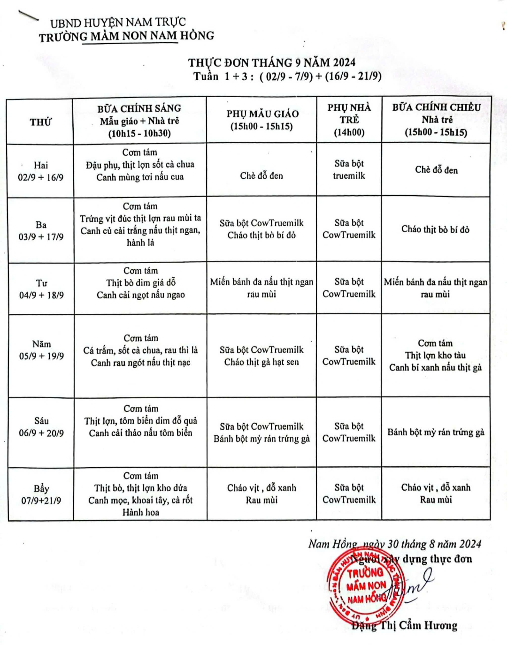 THỰC ĐƠN TUẦN 1+3 THÁNG 9 NĂM 2024